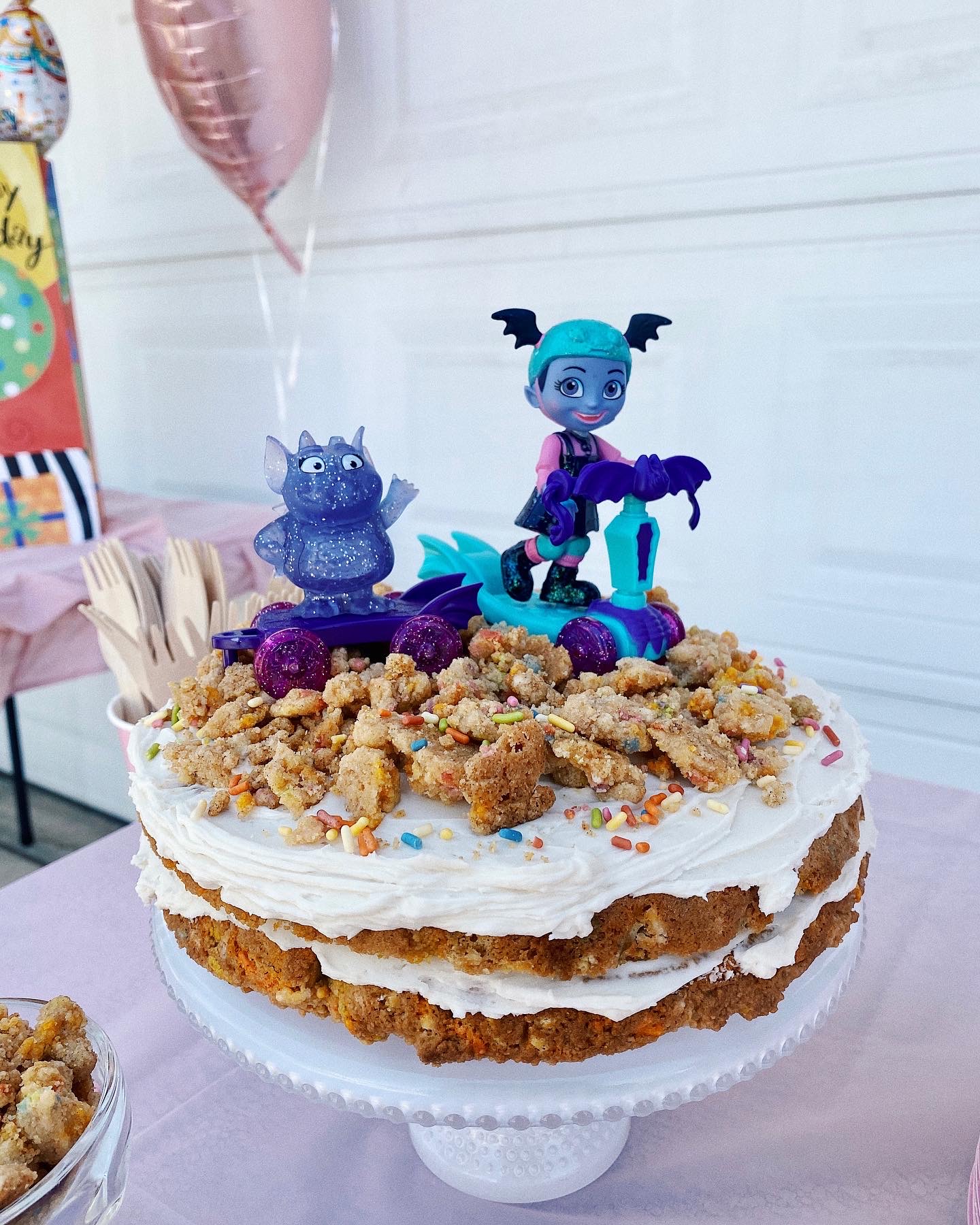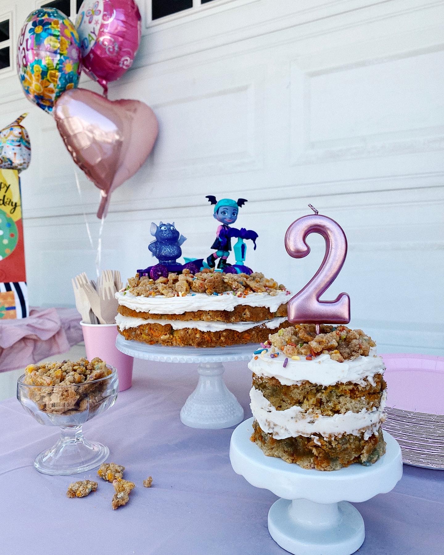 - Assemble your cake as desired! I cut the cake in half to make layers and left the sides a little “naked”. I just cut out two circles in one of the cakes I made to create Poppy’s small cake since I didn’t have a mini cake pan. Here’s the link to the toy I used as her cake topper and the 2 candle!