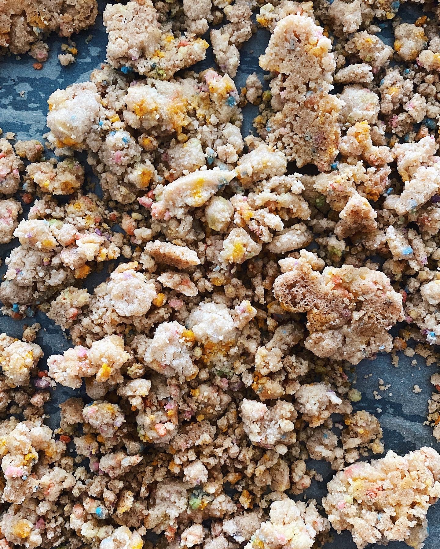 - Turn your oven down to 300° F to bake the Birthday Cake Crumbled and line a rimmed baking sheet with parchment paper.