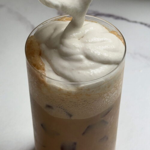 Top with additional vanilla cold foam and caramel sauce if desired, then stir and sip.