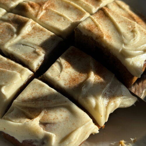 • Spread the cream cheese frosting evenly over the cooled cake. Sprinkle a pinch of cinnamon on top for that extra cozy!!