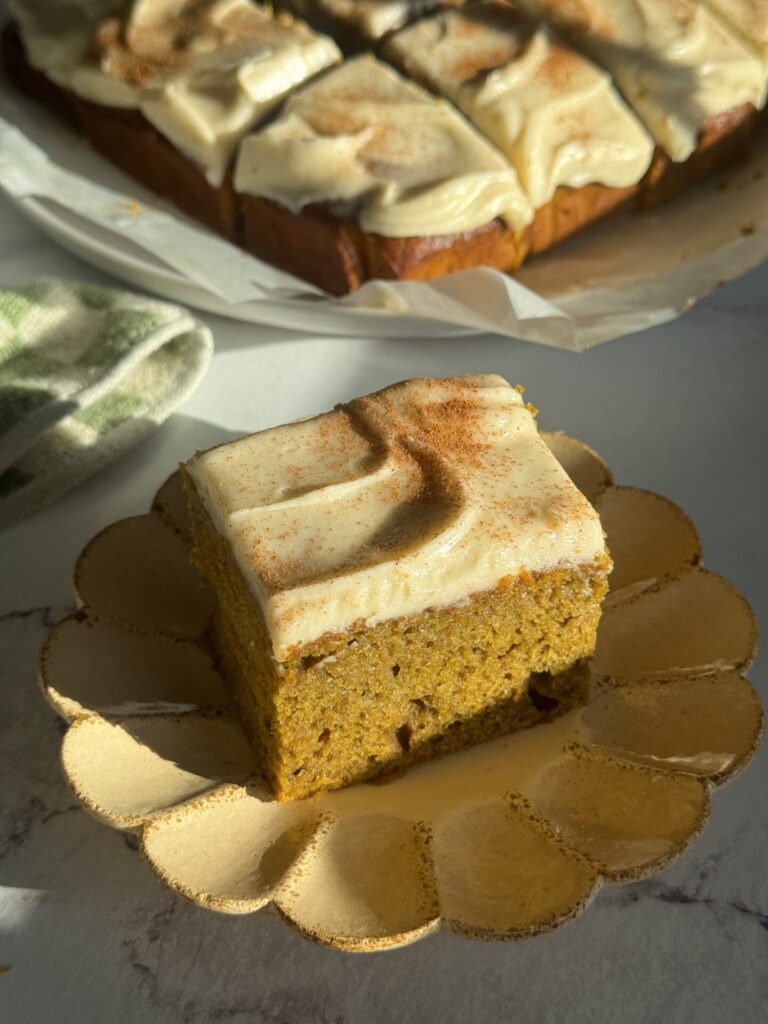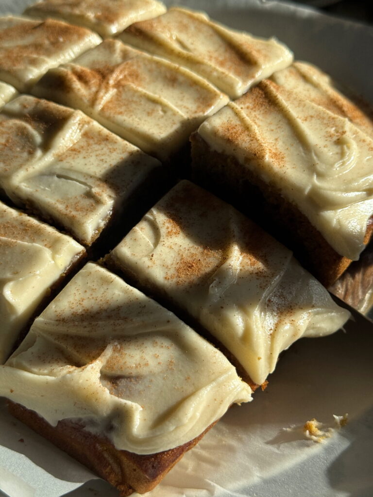 • Spread the cream cheese frosting evenly over the cooled cake. Sprinkle a pinch of cinnamon on top for that extra cozy!!