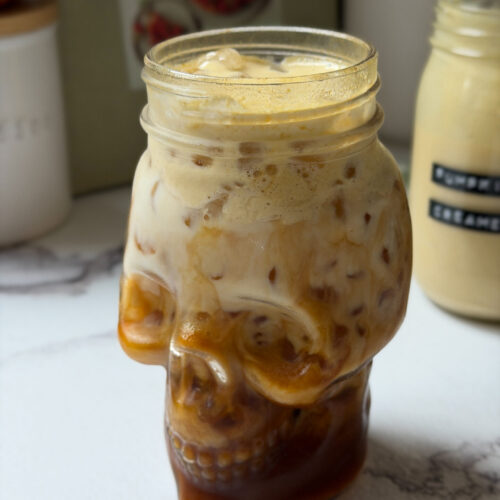 This drink is everything I want on a crisp morning — smooth espresso shaken with pumpkin puree, pumpkin pie spice, and a pinch of sea salt to bring out all those warm, cozy flavors. Then it’s poured over ice, topped with creamy homemade cashew milk, and finished with a splash of my homemade pumpkin creamer for that dreamy, coffee-shop texture (without leaving your kitchen).
