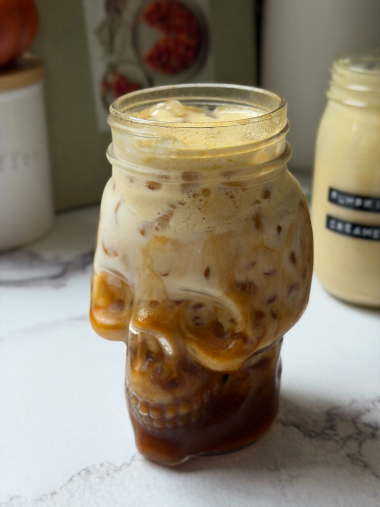 In a cocktail shaker or jar (aka SKULL jar) with a lid, combine the espresso, pumpkin puree, pumpkin pie spice, and sea salt.