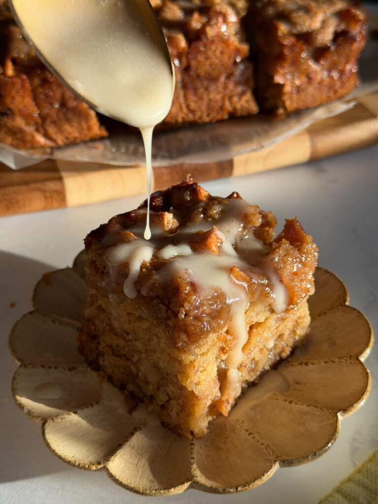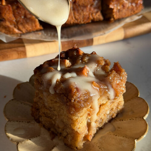 This cake is everything you want in a fall or winter dessert: soft, spiced, apple-filled, and drizzled with maple goodness. Perfect for brunch, coffee hour, or a cozy slice after dinner.
