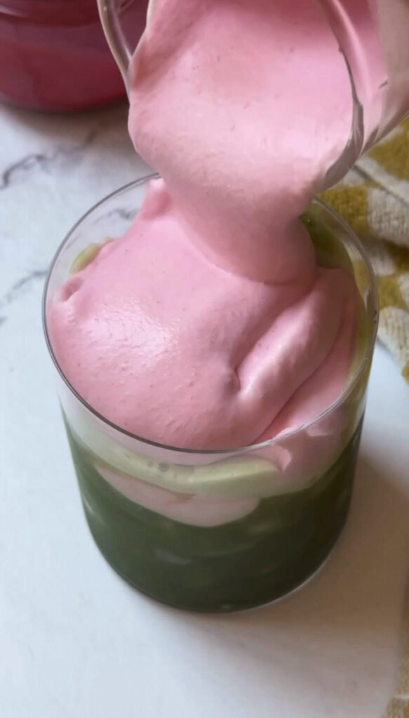 Fill a glass with ice. Pour in the matcha, then gently spoon or pour the raspberry cloud over the top. -