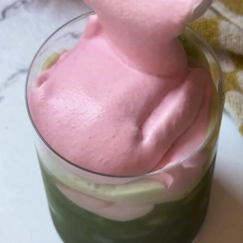 - Assemble. Fill a glass with ice. Pour in the matcha, then gently spoon or pour the raspberry cloud over the top.