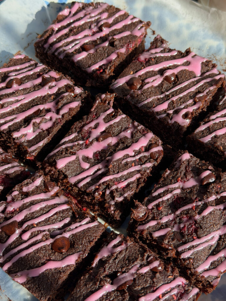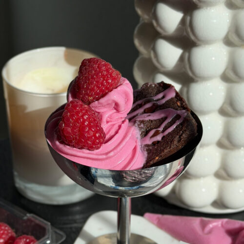 Fudgy gluten-free raspberry brownies topped with a creamy pink dairy-free white chocolate Ninja Creami swirl for the ultimate chocolate-meets-berry dessert. Rich, indulgent, and Lazy Girl Series–approved
