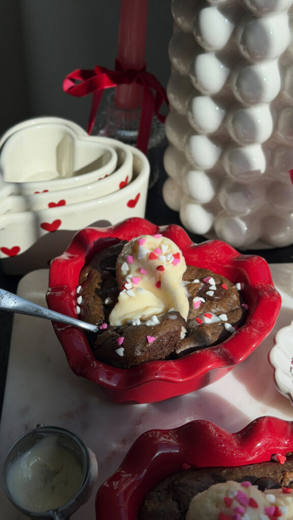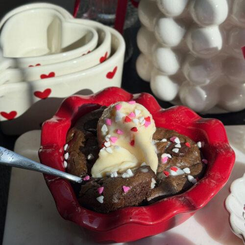 Fudgy almond butter brownies baked in individual heart ramekins, topped with creamy vanilla bean Ninja Creami and festive sprinkles. It feels planned. It feels romantic. It’s secretly so easy. Perfect for episode 6 of my Lazy Girl, Healthy Treats series!!