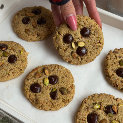 This is Episode 7 of my Lazy Girl Healthy Treats series — where we make desserts that feel a little elevated but are secretly so simple. These pistachio chocolate chip cookies are soft in the center, lightly crisp on the edges, packed with nutty flavor, and studded with melty chocolate.