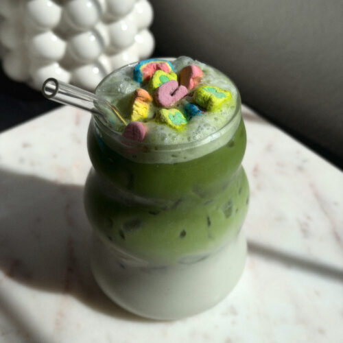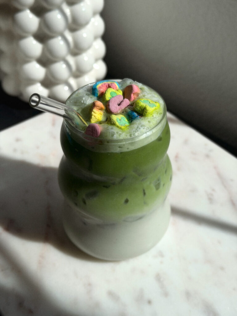 Normally our pantry leans pretty simple ingredient-focused around here, but every year when the St. Patrick’s Day decorations come out, I grab a tiny box for a little nostalgia moment. And instead of just pouring a bowl, I like to turn it into something a little more fun: Lucky Charms cereal milk matcha.