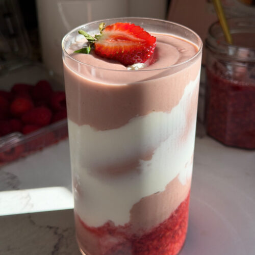 It’s creamy, glossy, strawberry-packed, and honestly just fun. But instead of spending $15+ on a smoothie, we’re making a version at home that still feels just as aesthetic and indulgent — while being a little more balanced.