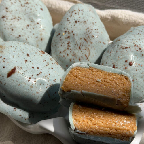 Inspired by everyone’s favorite peanut butter + chocolate candy, these little eggs are made with a creamy, naturally sweetened peanut butter filling and coated in a soft blue-green white chocolate shell to look just like speckled robin’s eggs.