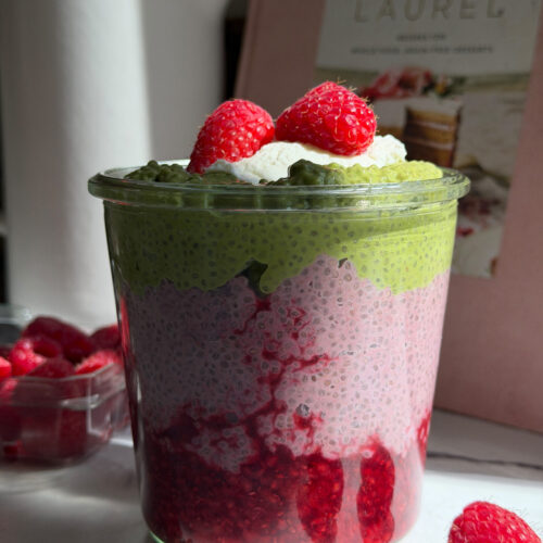 - Once thickened, layer into jars or glasses:Start with strawberry chia pudding then add matcha chia pudding on top