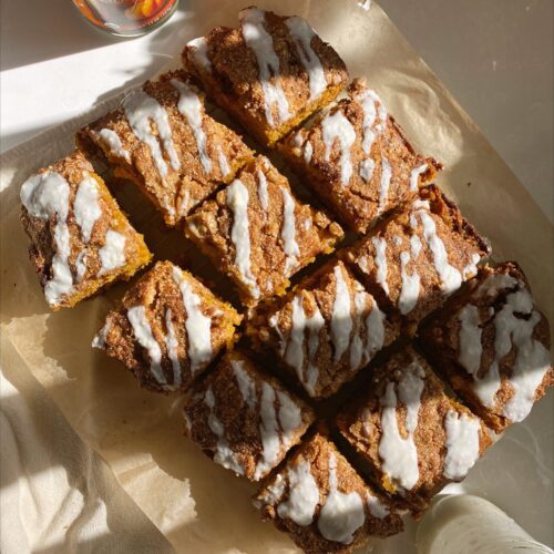 Pour batter into the prepared pan and sprinkle the streusel over it. Bake for 35-40 minutes. Remove from the oven, let cool for 40 minutes before drizzling the icing on top.