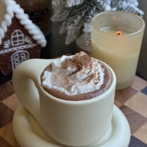 A cozy homemade hot chocolate powder made with cacao, coconut sugar, chocolate chips, and warm spices. Blend everything in a food processor, store for up to 3 months, and whisk 3–4 tablespoons into warm milk for the creamiest hot chocolate ever. Optional collagen and coconut milk powder for extra creaminess and protein.